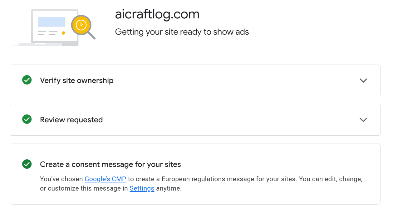 Applied for AdSense — Account creation → Code insertion → Ownership verification → Waiting for review