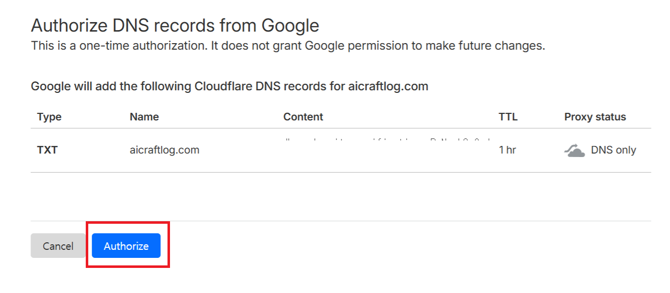 Copy the TXT record value Google provides, then add it to your DNS settings in the Cloudflare dashboard.