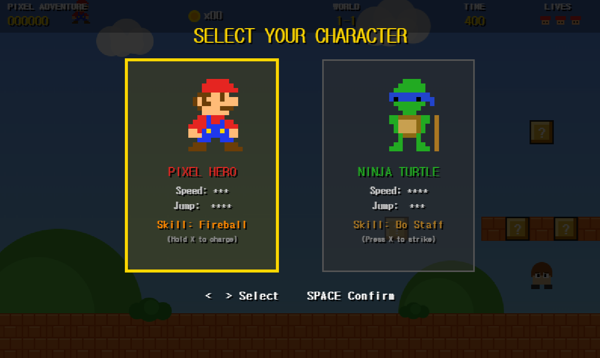 Make the character jump higher. Add a charge attack — hold to charge energy, release to fire. And add another character — a Ninja Turtle. The Ninja Turtle should attack with a staff.