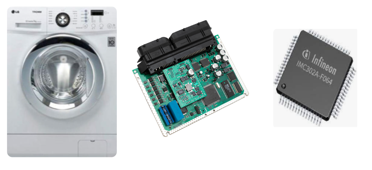 Take a washing machine. When you press a button, it washes, rinses, and spins — automatically. That's possible because there's a small computer inside called an ECU (Electric Control Unit). And inside that ECU sits a tiny black chip called an MCU (Micro Control Unit). The software that runs your washing machine lives inside that chip.
