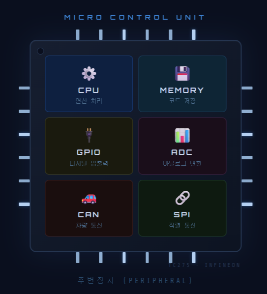 MCU stands for Micro Control Unit — a tiny, self-contained computer on a single chip.