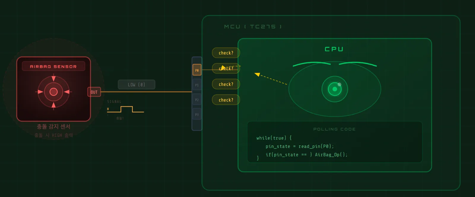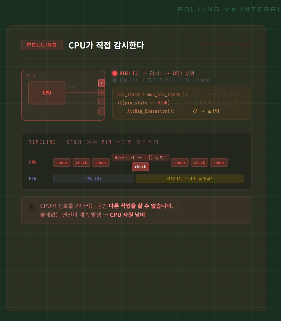 Imagine monitoring an airbag sensor this way. The CPU must constantly check the pin — and while it's doing that, it can't do anything else.