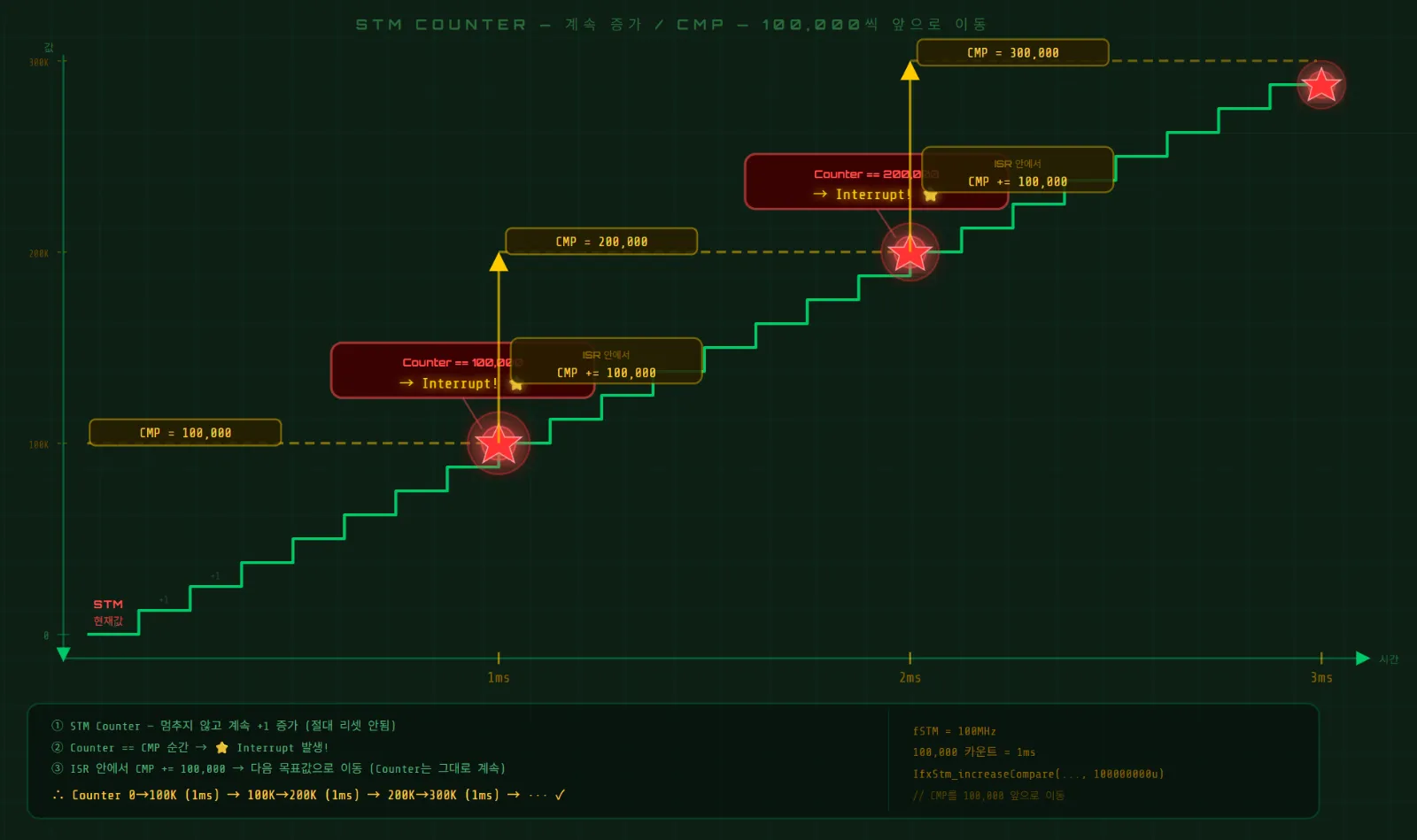 ISR runs → CMP += 100,000 (schedule next 1ms)