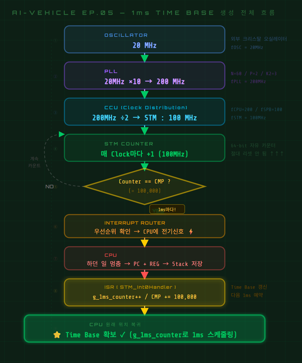 Learn why for-loop delays break timing in embedded systems, and how Timer + Interrupt creates a rock-solid 1ms Time Base on the TC275 MCU. Part of the AI-Vehicle series.